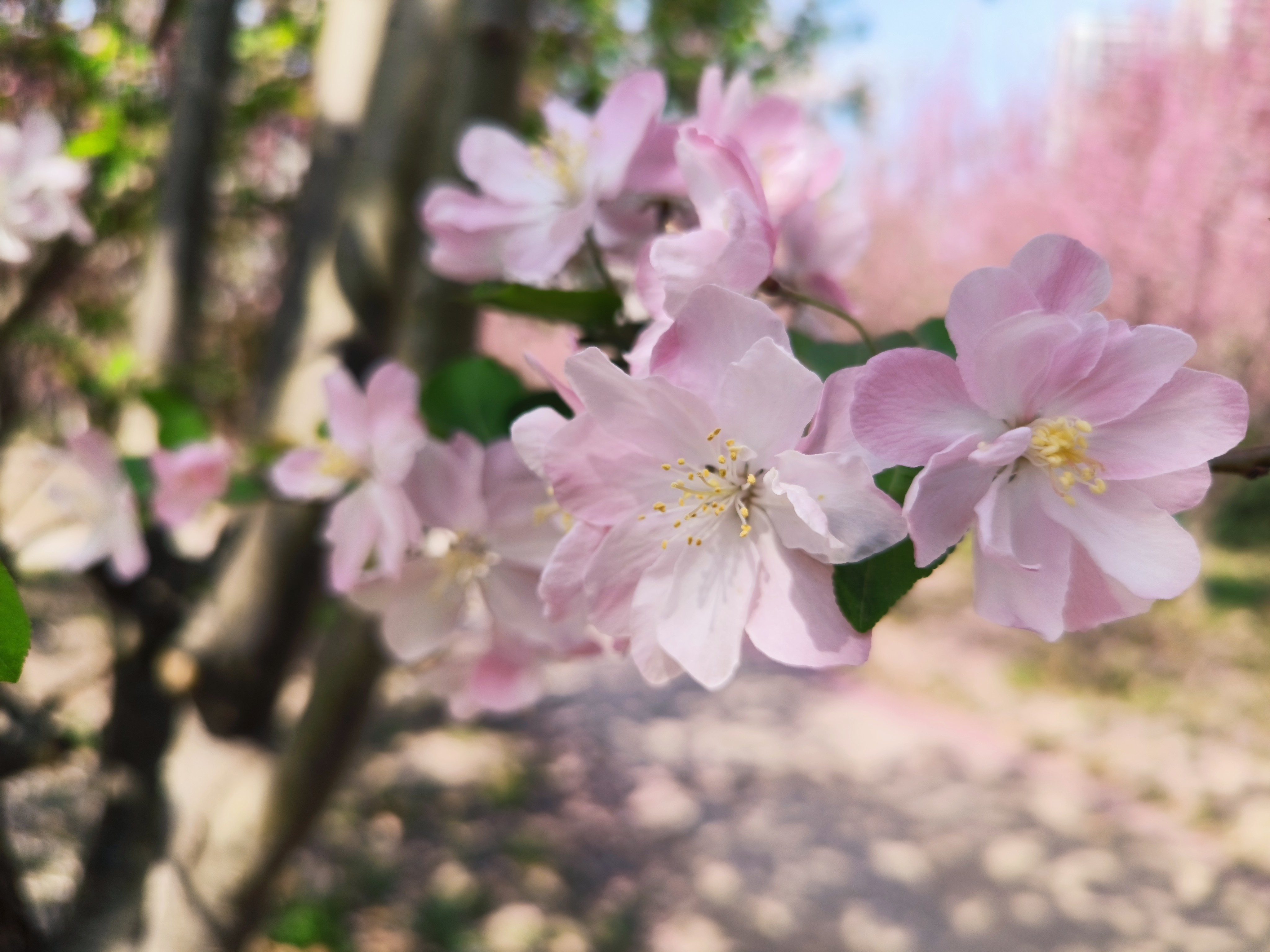 由粉红色逐渐变为白色的的垂丝海棠